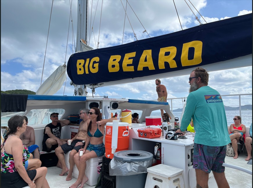 Big Beard captain at the helm, heading towards Buck Island.